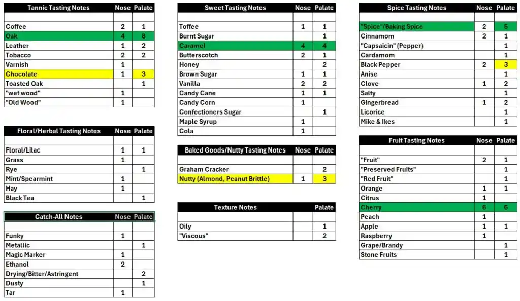 Even though we have one late submission to the group (hey, shit happens), it becomes quite clear what the group was thinking when 10 out of 15 guesses names a Sazerac-owned distillery or product as their guess. I guess I wouldn’t have thought that Buffalo Trace had such an identifiable character to it, but everyone was sure picking up on something that they’ve experienced before. Which traits were those? Let’s look at the prevailing tasting notes chart to see what they thought: