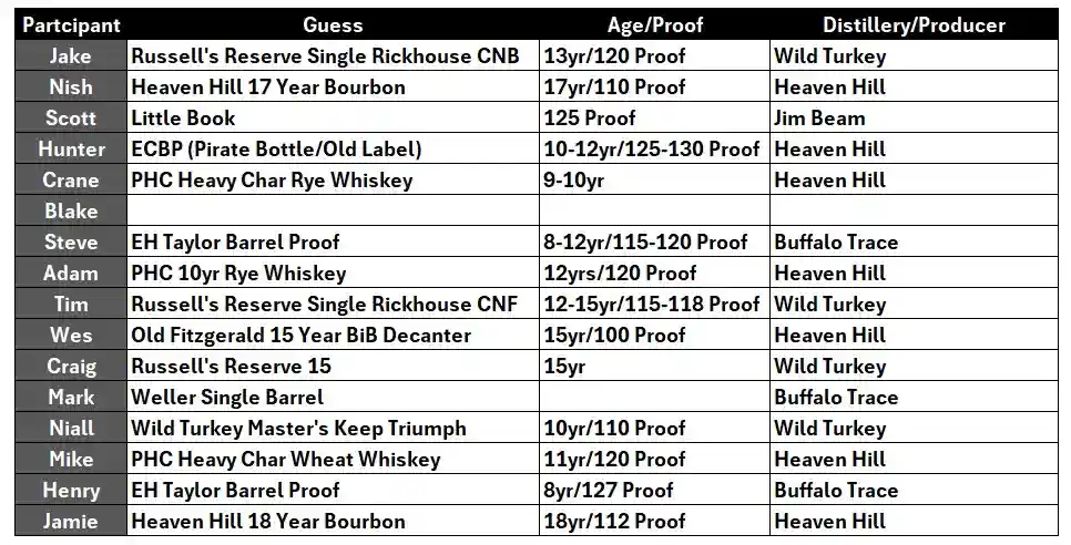 There’s a good split between Heaven Hill (7), Wild Turkey (4) and Buffalo Trace (3) guesses. As for the one Jim Beam guess, I’ve always thought it tastes pretty similar to both WT and HH, so you can see a theme building here. As for the other stats of age and proof, we can see the group is pretty solidly landing in the double digit age statements and a proof that’s likely above 110 and more than likely above 120. So what kinds of tasting notes did they find and will those get us any closer?
